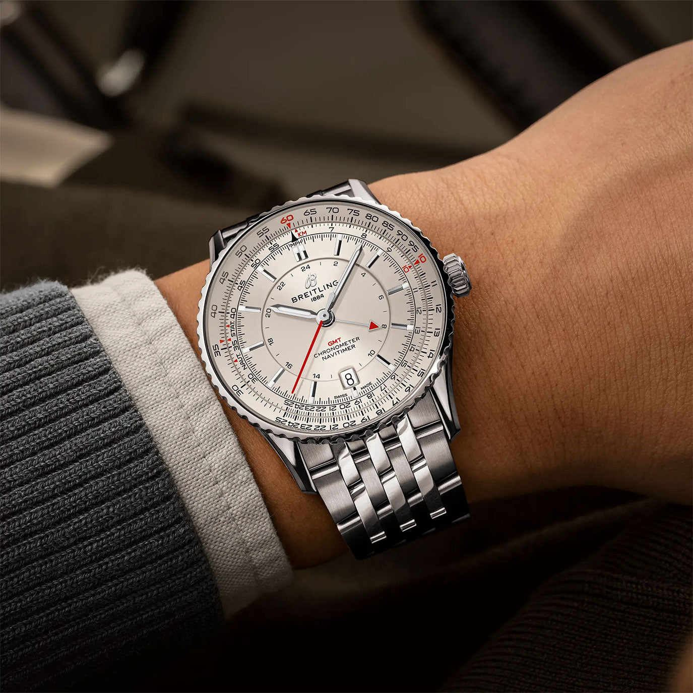 Breitling Navitimer Automatic GMT 41 is a refined tool watch designed for travelers who value precision and style. With its sleek silver dial and polished stainless steel case, this watch features a second time zone function, powered by the reliable Breitling Caliber 32. The red-tipped GMT hand allows you to track two time zones simultaneously, making it perfect for frequent flyers. This COSC-certified chronometer ensures outstanding accuracy, while the stainless steel bracelet adds both durability and elegance. The watch is unworn, in like-new condition, and comes complete with its box, papers, and warranty dated 2024.