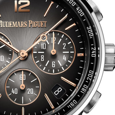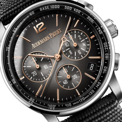 Unworn Audemars Piguet Code 11.59 SELFWINDING CHRONOGRAPH 26393CR.OO.A002KB.01. 41 mm, Smoked lacquered grey dial with sunray pattern base, pink gold applied hour-markers and hands, black lacquered inner bezel, 18-carat pink gold case, white gold bezel, lugs and caseback, double glareproofed sapphire crystal and caseback, 4401 calibre, Selfwinding movement, 70 h power reserve, 40 jewels, Black rubber-coated strap with 18-carat white gold pin buckle. Water resistant to 30 m.