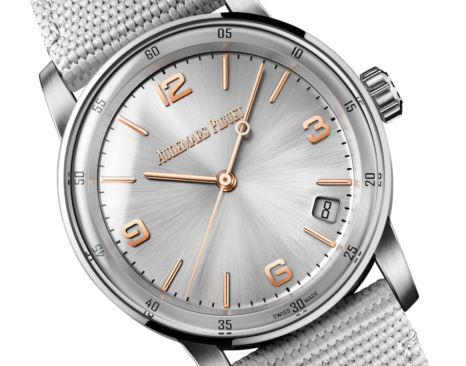 Unworn Audemars Piguet Code 11.59 SELFWINDING 15210CR.OO.A008KB.01. 41 mm, Grey lacquered dial with sunray pattern base, pink gold applied hour-markers and hands, grey lacquered inner bezel, 18-carat pink gold case, white gold bezel, lugs and caseback, double glareproofed sapphire crystal and caseback, 4302 calibre, Selfwinding movement, 70 h power reserve, 32 jewels, Grey rubber-coated strap with 18-carat white gold pin buckle. Water resistant to 30 m.