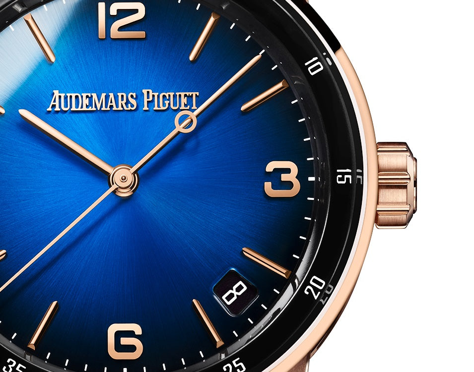 Unworn Audemars Piguet Code 11.59 SELFWINDING 15210OR.OO.A002KB.03. 41 mm, Smoked lacquered blue dial with sunray pattern base, 18-carat pink gold applied hour-markers and hands, black lacquered inner bezel, 18-carat pink gold case, double glareproofed sapphire crystal and caseback, 4302 calibre, Selfwinding movement, 70 h power reserve, 32 jewels, Blue rubber-coated strap with 18-carat pink gold pin buckle. Water resistant to 30 m.