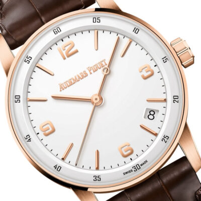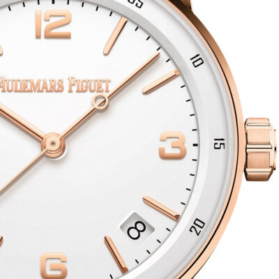 Unworn Audemars Piguet Code 11.59 SELFWINDING 15210OR.OO.A099CR.01. 41 mm, Lacquered white dial, 18-carat pink gold applied hour-markers and hands, 24-carat pink gold applied logo in galvanic growth, lacquered white inner bezel, 18-carat pink gold case, glareproofed sapphire crystal and caseback, 4302 calibre, Selfwinding movement, 70 h power reserve, 32 jewels, Hand-stitched “large square scale” brown alligator strap with 18-carat pink gold pin buckle. Water resistant to 30 m.