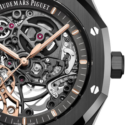 Unworn Audemars Piguet Royal Oak DOUBLE BALANCE WHEEL OPENWORKED Ref# 15416CE.OO.1225CE.01. 41 mm, Openworked slate grey dial, pink gold applied hour-markers and Royal Oak hands with luminescent coating, Black ceramic case, glareproofed sapphire crystal and caseback, screw-locked crown, 3132 calibre, Selfwinding movement, 45 h power reserve, 38 jewels, Black ceramic bracelet with AP folding clasp. Water resistant to 50 m.