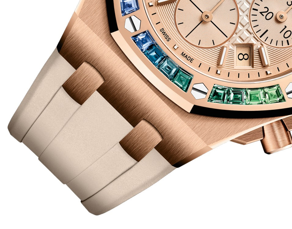 Unworn Audemars Piguet Royal Oak Offshore SELFWINDING CHRONOGRAPH 26236OR.YY.D085CA.01. 37 mm, Smoked pink gold-toned dial with “Lady Tapisserie” pattern, pink gold-toned counters, pink gold applied hour-markers and Royal Oak hands with luminescent coating, 18-carat pink gold case, glareproofed sapphire crystal, bezel set with baguette-cut “rainbow-coloured” sapphires, 18-carat pink gold pushpieces and screw-locked crown, 2385 calibre, Selfwinding movement, 40 h power reserve, 37 jewels, Beige rubber strap with AP folding clasp. Water resistant to 50 m.