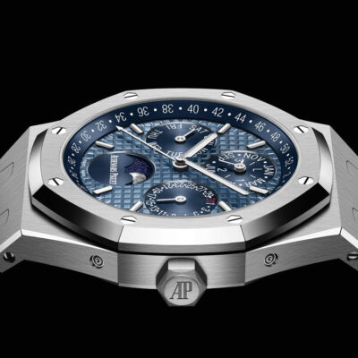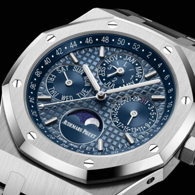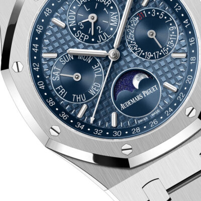 Unworn Audemars Piguet Royal Oak PERPETUAL CALENDAR 26574ST.OO.1220ST.03. 41 mm, Blue dial with “Grande Tapisserie” pattern, grey counters, white gold applied hour-markers and Royal Oak hands with luminescent coating, blue inner bezel, Stainless steal case, glareproofed sapphire crystal and caseback, 5134 calibre, Selfwinding movement, 40 h power reserve, 38 jewels, Stainless steel bracelet with AP folding clasp. Water resistant to 20 m.