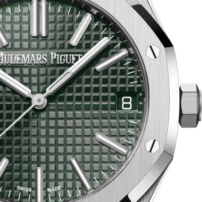Unworn Audemars Piguet Royal Oak SELFWINDING “50TH ANNIVERSARY” 15510ST.OO.1320ST.04. 41 mm, Khaki green dial with “Grande Tapisserie” pattern, white gold applied hour-markers and Royal Oak hands with luminescent coating, Stainless steel case, glareproofed sapphire crystal and caseback , screw-locked crown, 4302 calibre, Selfwinding movement, 70 h power reserve, 32 jewels,  Stainless steel bracelet with AP folding clasp. Water resistant to 50 m.