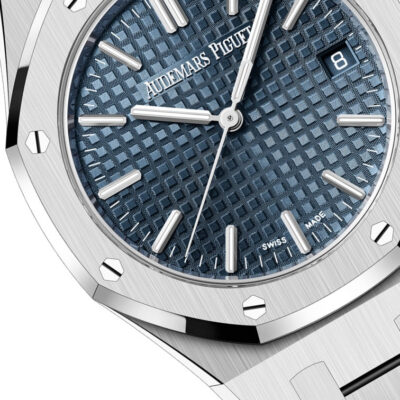 Unworn Audemars Piguet Royal Oak SELFWINDING “50TH ANNIVERSARY” 15550ST.OO.1356ST.02. 37 mm, Bleu nuit nuage 50 dial with “Grande Tapisserie” pattern, white gold applied hour-markers and Royal Oak hands with luminescent coating, Stainless steel case, glareproofed sapphire crystal and caseback, 5900 calibre, Selfwinding movement, 60 h power reserve, 29 jewels, Stainless steel bracelet with AP folding clasp. Water resistant to 50 m.