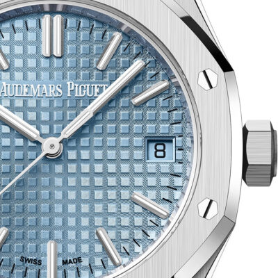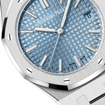 Unworn Audemars Piguet Royal Oak SELFWINDING “50TH ANNIVERSARY” 15550ST.OO.1356ST.04. 37 mm, Light blue dial with “Grande Tapisserie” pattern, white gold applied hour-markers and Royal Oak hands with luminescent coating, Stainless steel case, glareproofed sapphire crystal and caseback, 5900 calibre, Selfwinding movement, 60 h power reserve, 29 jewels, Stainless steel bracelet with AP folding clasp. Water resistant to 50 m.