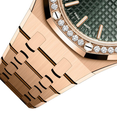 Unworn Audemars Piguet Royal Oak SELFWINDING “50TH ANNIVERSARY” 15551OR.ZZ.1356OR.03. 37 mm, Khaki green dial with “Grande Tapisserie” pattern, pink gold applied hour-markers and Royal Oak hands with luminescent coating, 18-carat pink gold case, bezel set with brilliant-cut diamonds, glareproofed sapphire crystal and caseback, 5900 calibre, Selfwinding movement, 60 h power reserve, 29 jewels, 18-carat pink gold bracelet with AP folding clasp. Water resistant to 50 m.