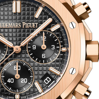 Unworn Audemars Piguet Royal Oak SELFWINDING CHRONOGRAPH “50TH ANNIVERSARY” 26240OR.OO.1320OR.02. 41 mm, Black dial with “Grande Tapisserie” pattern, black counters, pink gold applied hour-markers and Royal Oak hands with luminescent coating, 18-carat pink gold case, glareproofed sapphire crystal and caseback, screw-locked crown, 4401 calibre, Selfwinding movement, 70 h power reserve, 40 jewels, 18-carat pink gold bracelet with AP folding clasp. Water resistant to 50 m.