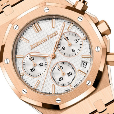 Unworn Audemars Piguet Royal Oak SELFWINDING CHRONOGRAPH “50TH ANNIVERSARY” 26240OR.OO.1320OR.03. 41 mm, Silver-toned dial with “Grande Tapisserie” pattern, silver-toned counters, pink gold applied hour-markers and Royal Oak hands with luminescent coating, 18-carat pink gold case, glareproofed sapphire crystal and caseback, screw-locked crown, 4401 calibre, Selfwinding movement, 70 h power reserve, 40 jewels, 18-carat pink gold bracelet with AP folding clasp. Water resistant to 50 m.