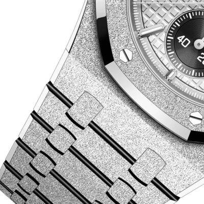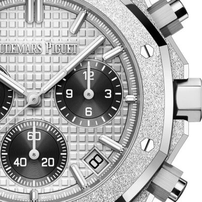 Unworn Audemars Piguet Royal Oak SELFWINDING CHRONOGRAPH 26240BC.GG.1324BC.01. 41 mm, Grey dial with “Grande Tapisserie” pattern, black counters, white gold applied hour-markers and Royal Oak hands with luminescent coating, Hammered 18-carat white gold case, glareproofed sapphire crystal, screw-locked crown, 4401 calibre, Selfwinding movement, 70 h power reserve, 40 jewels,  Hammered 18-carat white gold bracelet with AP folding clasp. Water resistant to 50 m.