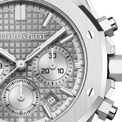 Unworn Audemars Piguet Royal Oak SELFWINDING CHRONOGRAPH 26715ST.OO.1356ST.02. 38 mm, Grey dial with “Grande Tapisserie” pattern, silver-toned counters, white gold applied hour-markers and Royal Oak hands with luminescent coating, Stainless steel case, glareproofed sapphire crystal, screw-locked crown, 2385 calibre, Selfwinding movement, 40 h power reserve, 37 jewels, Stainless steel bracelet with AP folding clasp. Water resistant to 50 m.