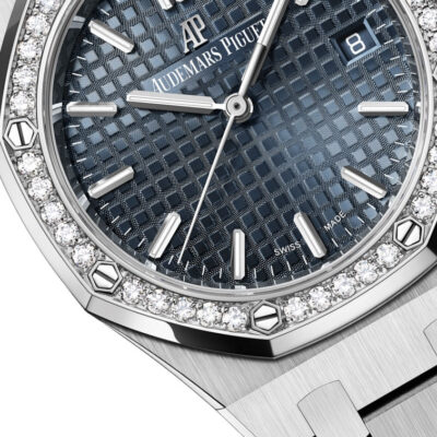 Unworn Audemars Piguet Royal Oak SELFWINDING 77351ST.ZZ.1261ST.01. 34 mm, Blue-grey dial with “Grande Tapisserie” pattern, white gold applied hour-markers and Royal Oak hands with luminescent coating, Stainless steel case, diamond-set bezel, glareproofed sapphire crystal and caseback, 5800 calibre, Selfwinding movement, 28 jewels, 50 h power reserve, Stainless steel bracelet with AP folding clasp. Water resistant to 50 m.