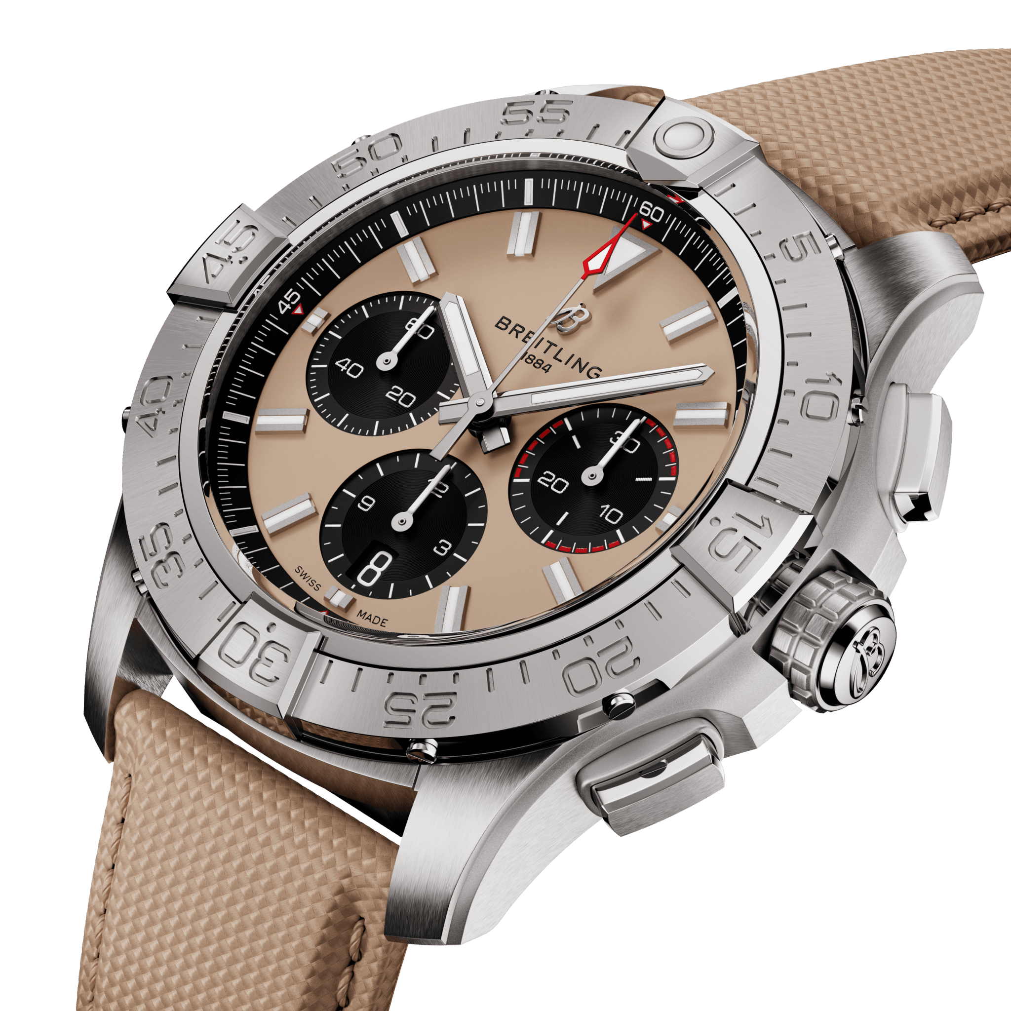 Unworn watch the Breitling Avenger B01 Chronograph 44, Reference AB0147101A1X1 bold, extremely robust and shock resistant. Brushed and satin finished Stainless Steel case with polished finished edges combine precision, durability and powerful design. The model has Beige dial with black sub-dials and black dial flange. On it printed white minute markers with Arabic numerals marking every 15-minutes interval. The polished hour and minute hands and index hour markers are luminous and provide excellent legibility even in poor lighting conditions. Small seconds counter located at the 9 o’clock position. Date window located at the 6 o’clock position. Chronograph/stopwatch functions: large central second’s hand featuring a red arrowhead tip and luminous fill with capable of counting time up to 1/4th of a second; 30-minute counter sub-dial located at the 3 o’clock position; 12-hour counter located at the 6 o’clock position. The watch has Stainless Steel crown Screw locked with two gaskets of with a special grip-pattern for a comfortable grip and chronograph pushers. On the crown printed Logo Breitling. The dial closed by a sapphire crystal, glare-proofed both sides. A screw-on, durable case back securely covers the watch mechanism. The watch is equipped unidirectional-ratcheted rotating Stainless Steel bezel with engraved Arabic numerals, indexes and large dot at the origin. The Watch comes with Breitling 01 automatic chronograph movement, which beats at 28,800 vph, contains 45 jewels, and has an approximate power reserve of 70 hours. The watch presented on a Sand calfskin leather strap with Stainless steel Folding clasp. The water resistance is up to 300m/1000ft.