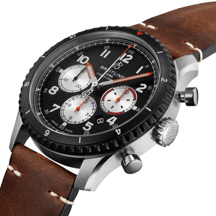 Breitling Aviator 8 B01 Chronograph 43 Mosquito. Black dial 43 mm Stainless Steel case. Bidirectional bezel, Cambered sapphire, glareproofed both sides crystal. Breitling 01 (Manufacture) calibre, Self-winding mechanical, 70 hrs power reserve, 47 jewels. Calfskin Leather strap Tang-type clasp. Water resistance 100 m (330 ft).
