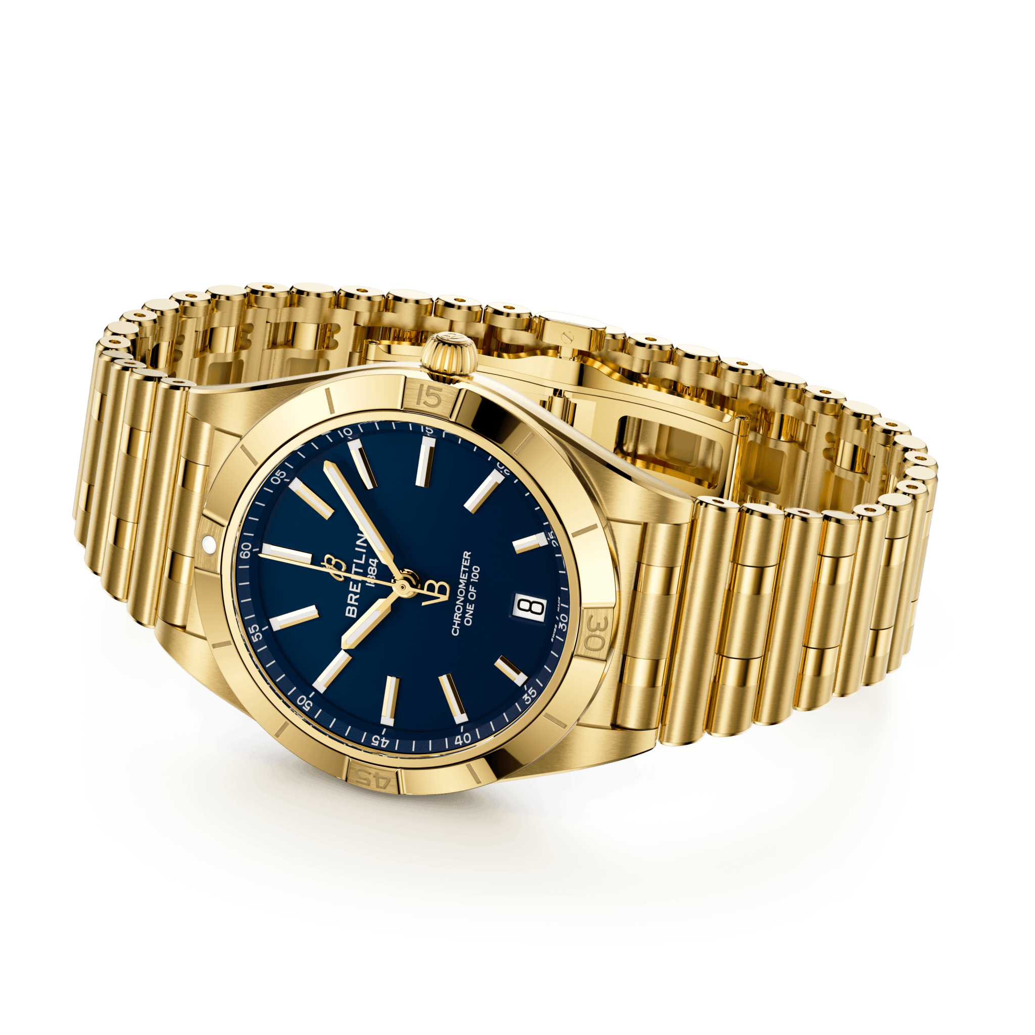Unworn Ladies watch Breitling Chronomat Automatic 36 Victoria Beckham, case brushed and polished 18k Yellow Gold, Reference K103801A1C1K1. Precise and sophisticated, this exquisite timepiece is more than just a timepiece – it is a statement of style and substance. With their elegant design and impeccable functionality, they seamlessly combine luxury and versatility, making them the ideal companion for any occasion. Crafted with meticulous attention to detail, they have an impeccable Midnight blue dial, which is decorated with a Yellow Gold “B” emblem below the 12 o’clock position. Perfect hour markers made of polished 18k Yellow Gold with luminous dots fill the dial with special luxury. Polished 18k Yellow Gold hands with luminous filling ensure high readability even in the dark. The slender 18k Yellow Gold seconds hand has a special design, having an arrowhead with luminescent filling and in contrast the manufacturer’s logo “B”. Along the outer perimeter of the dial is a finely printed minute/second track with Arabic numerals every 5 minutes. Date window located at the 6 o’clock position. The inscription on the dial enhances the status of the watch: “One of 100” and “Victoria Beckham” on the reverse side. The dial closed by a Cambered Scratch-resistant Sapphire Crystal with glare-proofed both sides. A screw-on, durable 18k Yellow Gold case back securely covers the watch mechanism. The non-screw-lock crown is made of polished 18k Yellow Gold with two gaskets, has a ribbed edge for easy grip, and features the Breitling logo from the end. The watch features a polished 18k Yellow Gold unidirectional rotating bezel with a ratcheting mechanism, a large luminous dot at the origin, and brushed 1/4-hour inlays. The Model comes with Breitling Caliber 10 contains 25 Jewels and has an approximate power reserve of 42 hours. The watch presented on the Featuring Breitling’s iconic and comfortable “Rouleaux” bracelet of brushed and polished 18k Yellow Gold with a butterfly clasp. This model comes with a branded travel pouch. The water resistance is up to 100m/330ft.