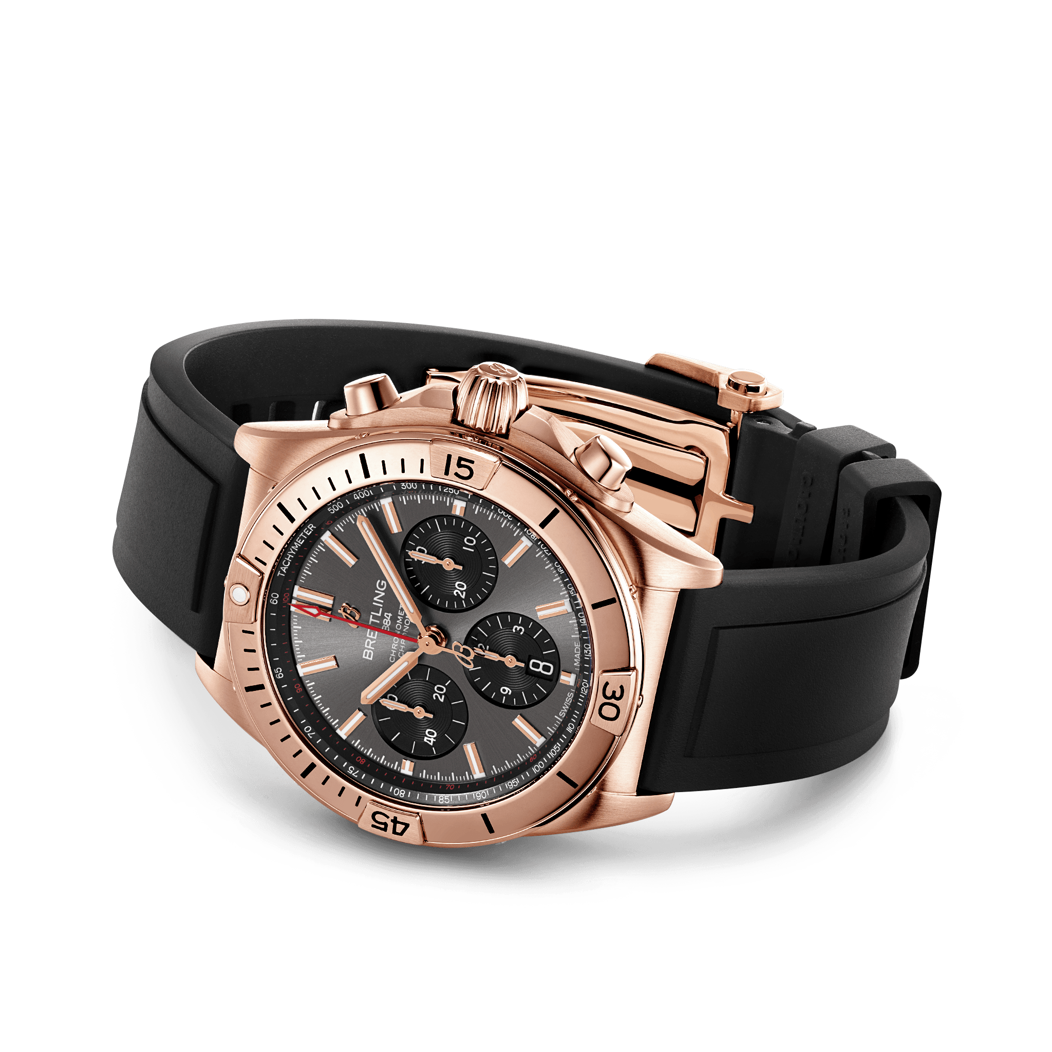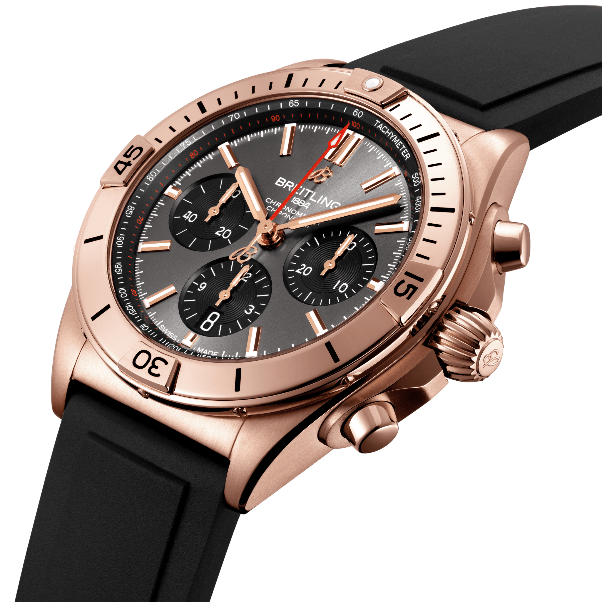 Unworn watch Breitling Chronomat B01 42, case brushed and polished 18k Red Gold, Reference RB0134101B1S1. A bold and dynamic timepiece that embodies the spirit of modern adventure and technical excellence. Crafted with meticulous attention to detail, these timepieces are a combination of robust functionality and contemporary style, designed to meet the needs of today’s active lifestyle. The striking Anthracite dial features contrasting 18k Red Gold hands with luminous fill and applied polished 18k Red Gold index hour markers with luminous fill for exceptional legibility at a glance. Complete with chronograph black sub-dials and 18k Red Gold “B” emblem below the 12 o’clock position this watch is both functional and stylish. Black dial flange with Tachymeter scale and fine printed minute/seconds track intervals on the outer perimeter dial. Date window located at the 6 o’clock position. Small seconds sub-dial at 9 o’clock. The dial closed by a Cambered Scratch-resistant Sapphire Crystal with glare-proofed both sides. The transparent sapphire crystal case back reveals the mesmerizing operation of the movement. The polished Stainless Steel Screw-locked “onion” crown with two gaskets, a classic Chronomat feature named for its fluted-dome shape allows for easy adjustments. On its end there is Breitling logo is applied. Chronograph/Stopwatch functions: column wheel mechanism; the slender seconds hand has a special design, having Red an arrowhead with luminescent filling and the 18k Red Gold manufacturer’s logo “B” on the other side; 30-minute counter sub-dial located at the 3 o’clock position; 12-hour counter sub-dial at the 6 o’clock position. On the right side, case also houses the 18k Red Gold chronograph buttons a cylindrical shape. The watch is equipped polished 18k Red Gold unidirectional-ratcheted rotating bezel ring with brushed finished 1/4 hour rider tabs. The Model comes with Breitling Caliber B01 contains 47 Jewels and has an approximate power reserve of 70 hours. The watch presented on the Black Rubber Strap with 18k Red Gold Folding Clasp. The water resistance is up to 200m/660ft.