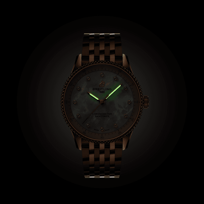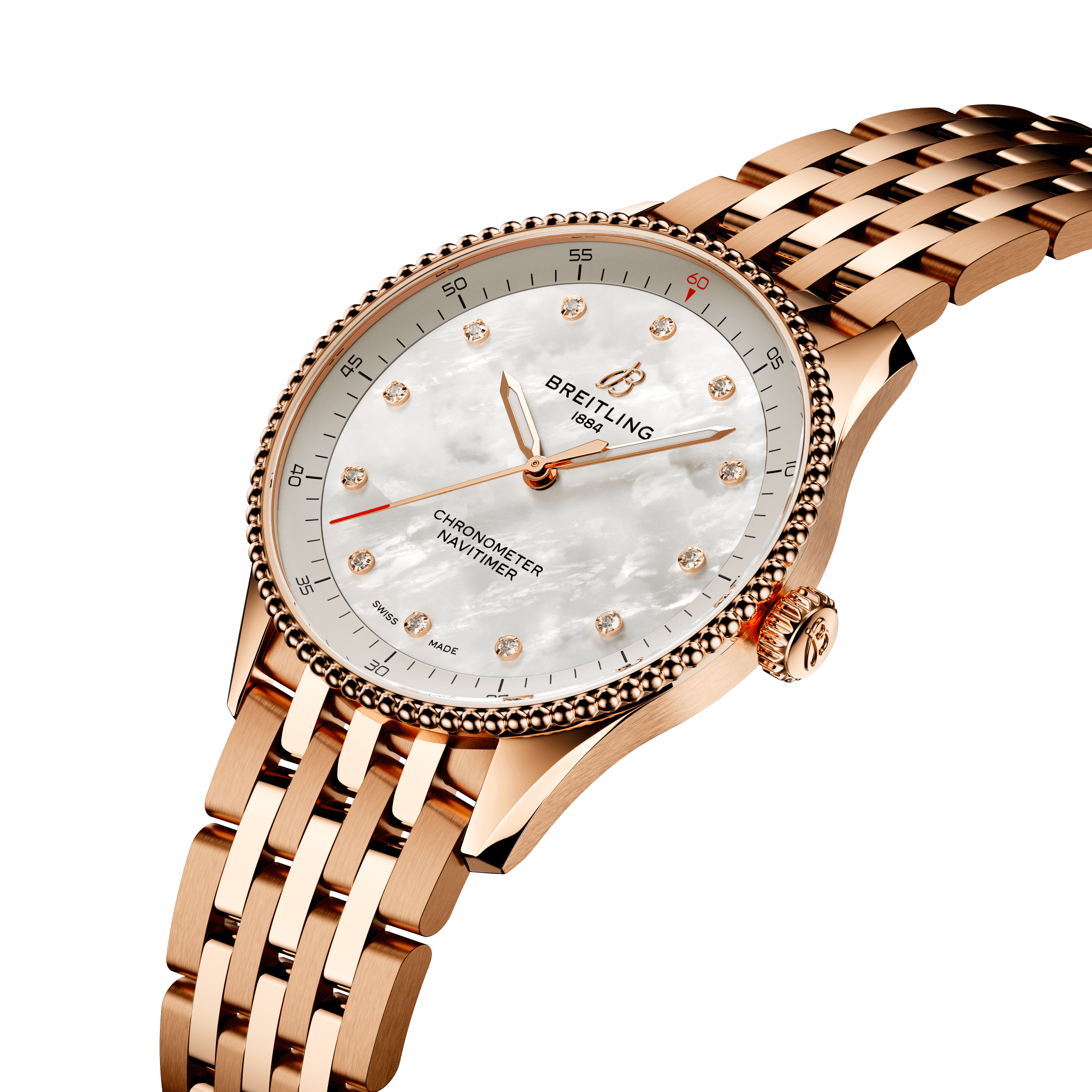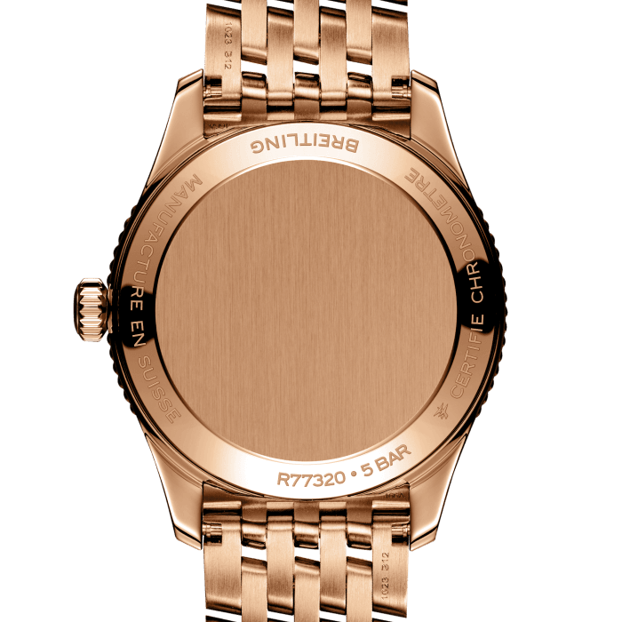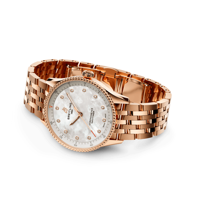 Unworn watch Breitling Navitimer 32, Small-scale traceable 18k Red Gold, Reference R77320E61A1R1 – epitomizes the essence of adventure and precision in horology. Thanks to its timeless design and cutting-edge technology, these watches will create a luxurious look and become a true companion for the modern woman, both on travel and in everyday life. This model features a mother-of-pearl dial with exquisite diamond hour markers for a jewel-like appeal – adding an elegance to an iconic watch. Recognizable Red Gold “B” emblem below the 12 o’clock position. Attract attention polished luminous Red Gold hour and minute hands and Red Gold Red-tipped seconds hand. Along the flange of the dial, there is a printed minute track with Arabic numerals indicating every 5 minutes. The watch has Small-scale traceable 18k Red Gold Pull/push non screw-locked crown with a two gaskets. The crown with a ribbed edge for a comfortable grip and from the butt Breitling logo. The dial closed by a Cambered sapphire crystal, glareproofed both sides. The screwed solid case back is made of Small-scale traceable 18k Red Gold. The dial is framed by the signature fixed beaded Small-scale traceable 18k Red Gold bezel. A masterpiece of engineering, Swiss Quartz Thermocompensate SuperQuartz movement Breitling’s in-house Caliber 77 contains 3 jewels. Its exceptional precision allows conquering every moment with unwavering precision. This model presented on a brushed and polished Small-scale traceable 18k Red Gold Navitimer bracelet, which fastens Small-scale traceable 18k Red Gold Folding Clasp. The water resistance is up to 50m/150ft.