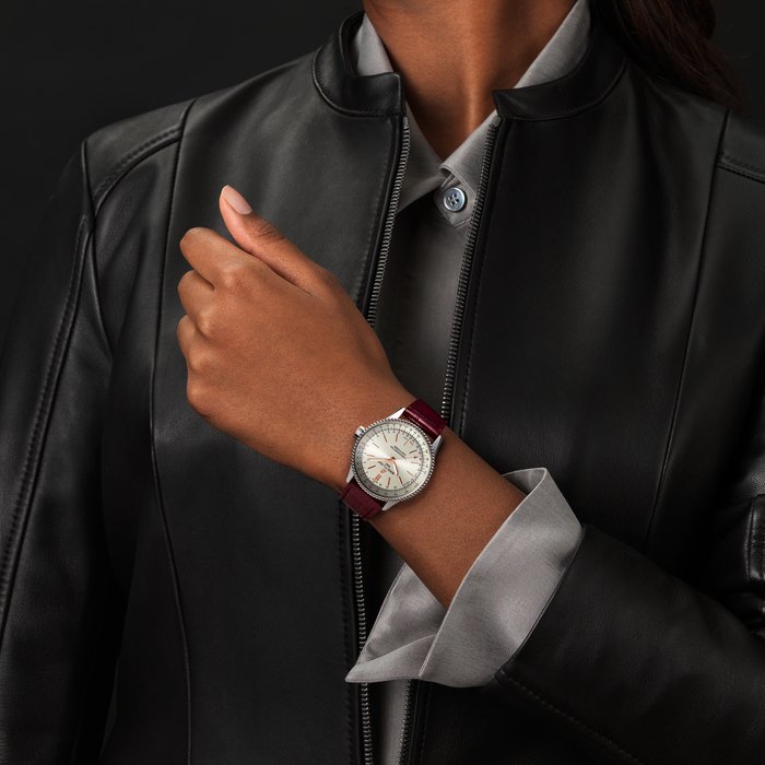 Breitling Navitimer Automatic 35 watch, 35mm, polished stainless steel case, Reference A17395F41G1P1. This model has Silver dial with a fine sunray finish and Tachymeter scale on dial flange. Polished luminous Rose gold-tone hour and minute hands with Red-tipped seconds hand, applied 18k Rose Gold index hour markers. On the outer edge of the dial, there is a Navitimer scale with minutes and seconds in small print. Stainless steel Pull / push non screw-locked crown with a two gaskets and logo Breitling. The dial closed by a Cambered sapphire crystal, glareproofed both sides. The screwed solid case back is made of Stainless Steel. The watch is equipped bidirectional rotating beaded Stainless Steel bezel with slide rule. The watch is self-winding mechanical Breitling in-house caliber 17 contains 25 jewels and has an approximate power reserve of 38 hours. This model presented on a Straight Burgundy Alligator Leather strap with a Stainless Steel Tang-type Buckle Clasp. The water resistance is up to 30m/100ft.