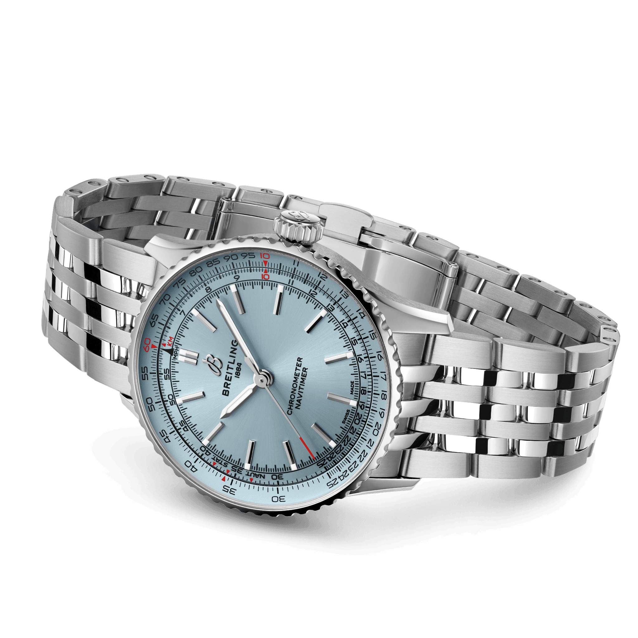 Unworn watch Breitling Navitimer Automatic 41, Reference A17329171C1A1 – epitomizes the essence of adventure and precision in horology. With its timeless design and cutting-edge engineering, this watch is a true companion for the modern explorer, whether navigating the skies or conquering the urban landscape. This model has ice blue dial with a fine sunray finish and Tachymeter scale on dial flange. Recognizable Silver tone “B” emblem below the 12 o’clock position. Attract attention polished luminous silver-tone hour and minute hands and Red-tipped seconds hand. On dial applied polished silver-tone index hour markers with luminous dots. On the outer edge of the dial, there is a Navitimer scale with minutes and seconds in small print. The watch has Stainless steel Pull/push non screw-locked crown with a two gaskets. The crown with a ribbed edge for a comfortable grip and from the butt Breitling logo. The dial closed by a Cambered sapphire crystal, glareproofed both sides. The screwed solid case back is made of Stainless Steel. The dial is framed by a signature bi-directional fluted Stainless Steel bezel with slide rule and a scalloped profile for easy grip. A masterpiece of engineering, Breitling’s in-house Caliber 17 contains 26 jewels and has an approximate power reserve of 38 hours, ensuring exceptional precision, allowing you to conquer every moment with unwavering precision. This model presented on a brushed and polished Stainless Steel Navitimer bracelet with a Stainless Steel Push Button Folding Clasp. The water resistance is up to 30m/100ft.