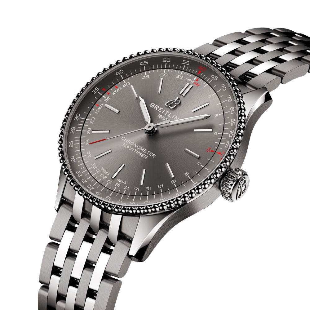 Unworn Breitling Navitimer Automatic A17327381B1A1, 36 mm, Anthracite dial, Stainless steel case. Bidirectional, slide rule bezel. Cambered sapphire, glareproofed both sides crystal. Breitling 17 calibre, Self-winding mechanical movement, 38 hrs power reserve, 26 jewels. Stainless steel bracelet. Water resistance 30 m.
