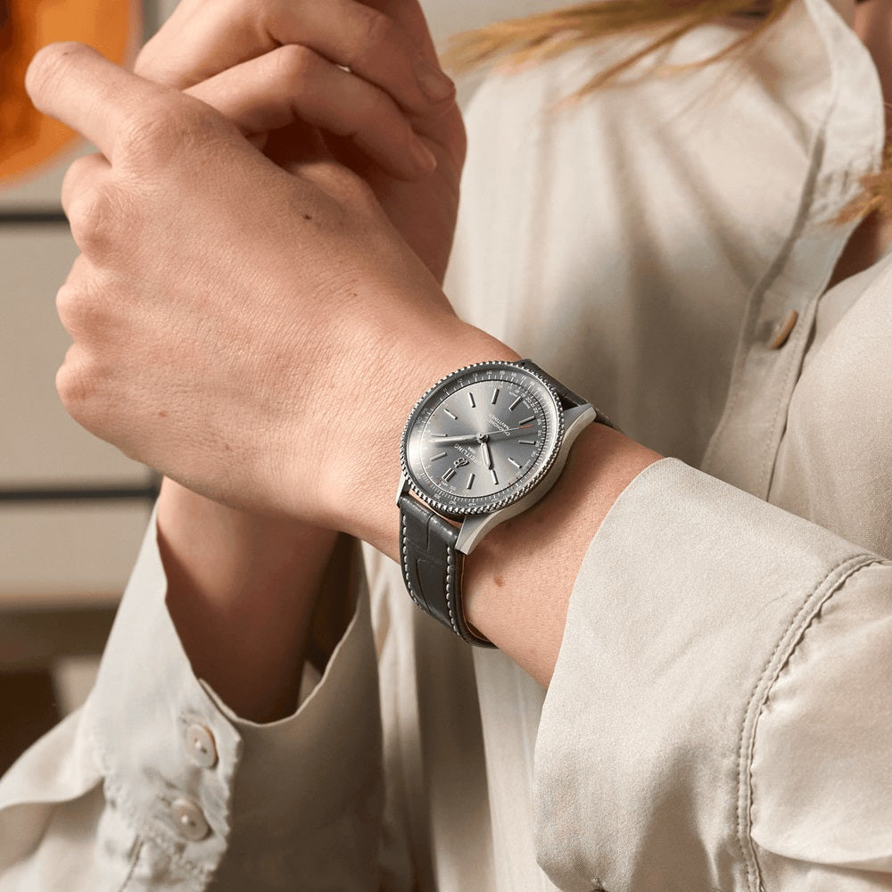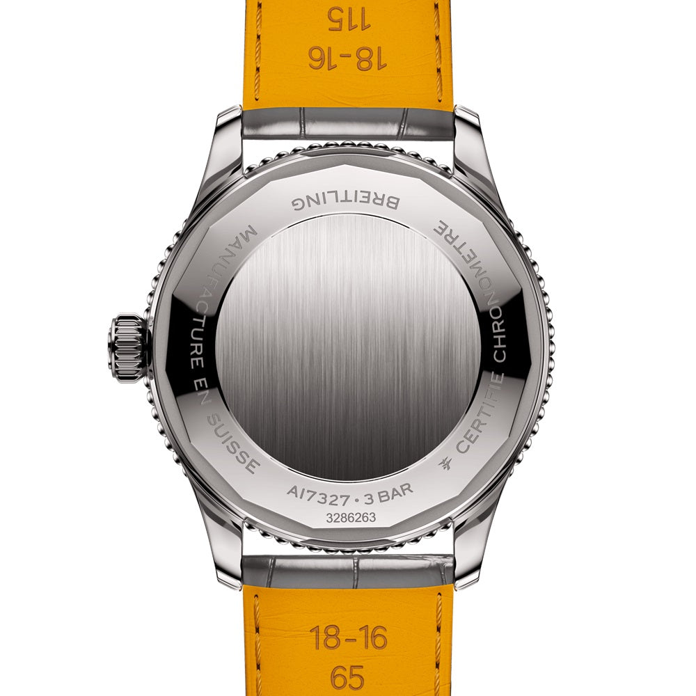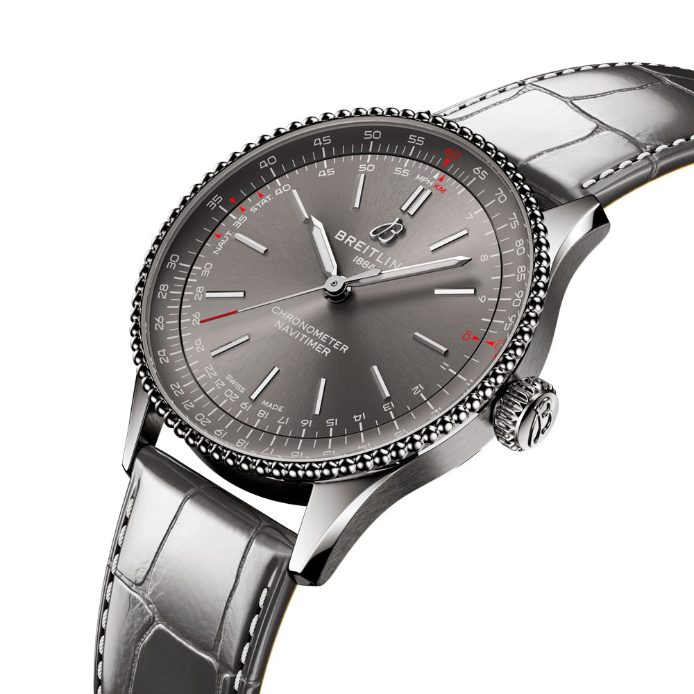 Unworn Breitling Navitimer Automatic A17327381B1P1, 36 mm, Anthracite dial, Stainless steel case. Bidirectional, slide rule bezel. Cambered sapphire, glareproofed both sides crystal. Breitling 17 calibre, Self-winding mechanical movement, 38 hrs power reserve, 26 jewels. Alligator leather stap with Folding clasp. Water resistance 30 m.