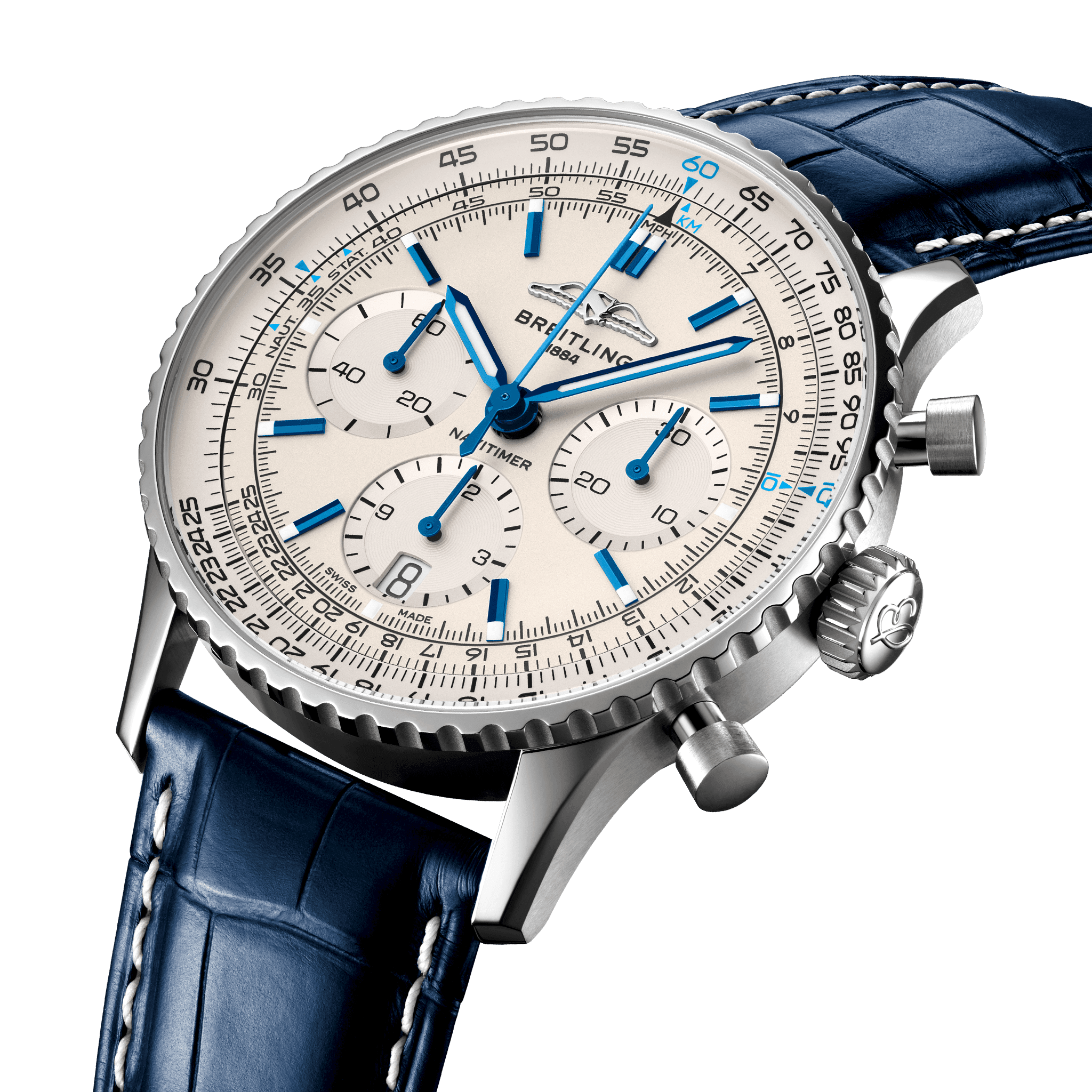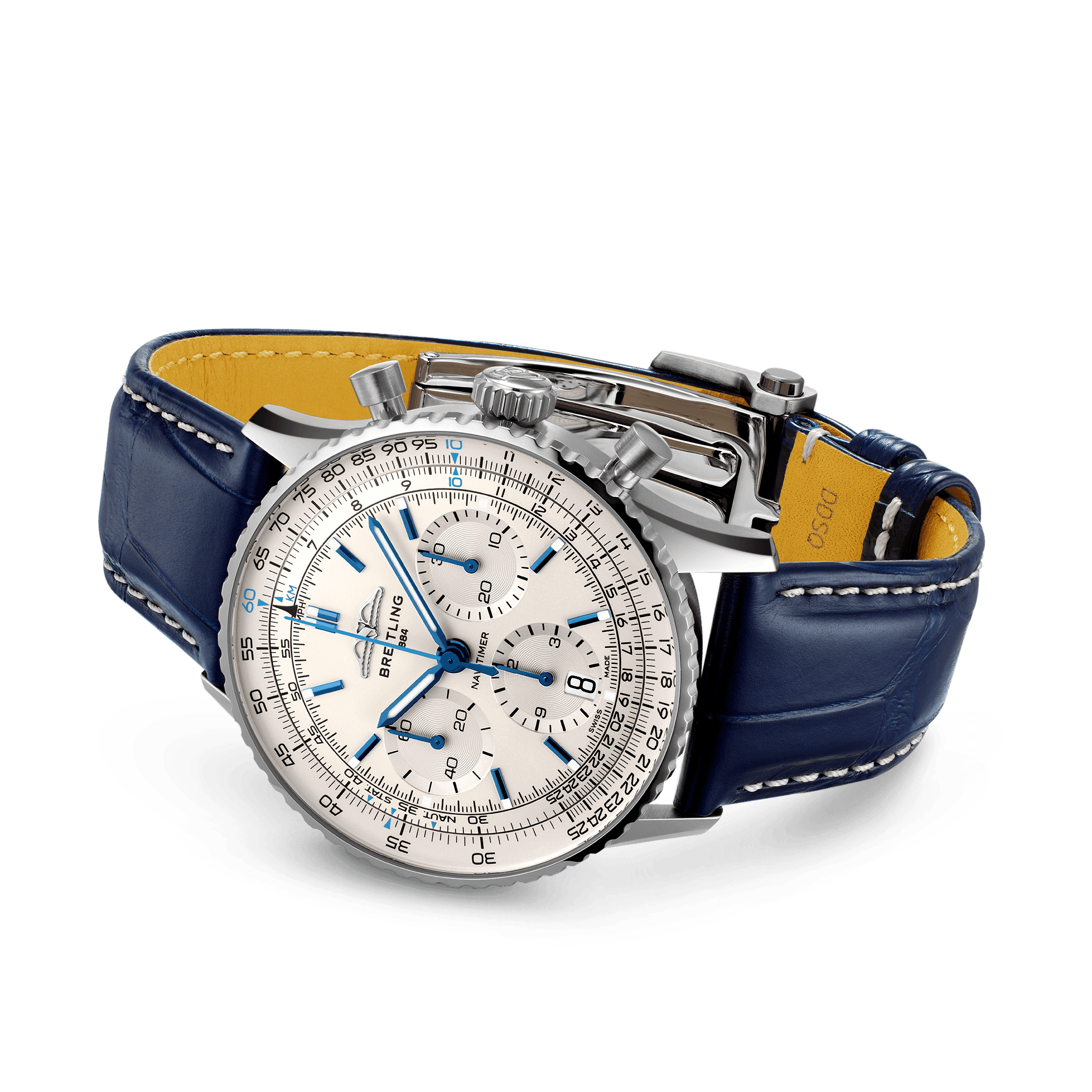 Unworn watch Breitling Navitimer B01 Chronograph 41 in Brushed and Polished Stainless Steel case, Reference AB0139A71G1P1. In a world where precision meets elegance, they reign supreme as they are crafted with meticulous attention to detail, embodying the spirit of aviation excellence and exuding timeless sophistication. Blue hands with luminescent filling and luminous baton indexes harmoniously complement the striking silver Tri-Compax dial.  Impressive are the AOPA wings, symbol of the Aircraft Owners and Pilots Association, the largest pilots’ club in the world, which in the 1950s chose the Navitimer as its official watch at 12 o’clock. The technical excellence of this model is achieved through the chronograph, which includes the Large Central Second Hand Chronograph; Sub-dial for 30-minute counter at 3 o’clock; 12-hour counter subdial at 6 o’clock. The functionality of the watch is enhanced by the typical circular slide rule, allowing pilots to perform all necessary flight calculations. The dial closed by a Cambered Scratch-resistant Sapphire Crystal with glare-proofed both sides. Of Sapphire Crystal made transparent case back. The watch features a bi-directional fluted stainless steel bezel with a scalloped profile for easy grip. A masterpiece of engineering, Breitling’s in-house Caliber 01 contains 47 jewels and has an approximate power reserve of 70 hours, ensuring exceptional precision, allowing you to conquer every moment with unwavering precision. The watch presented on the Blue Alligator leather strap with Stainless steel Folding Clasp. The water resistance is up to 30m/99ft (3 ATM).