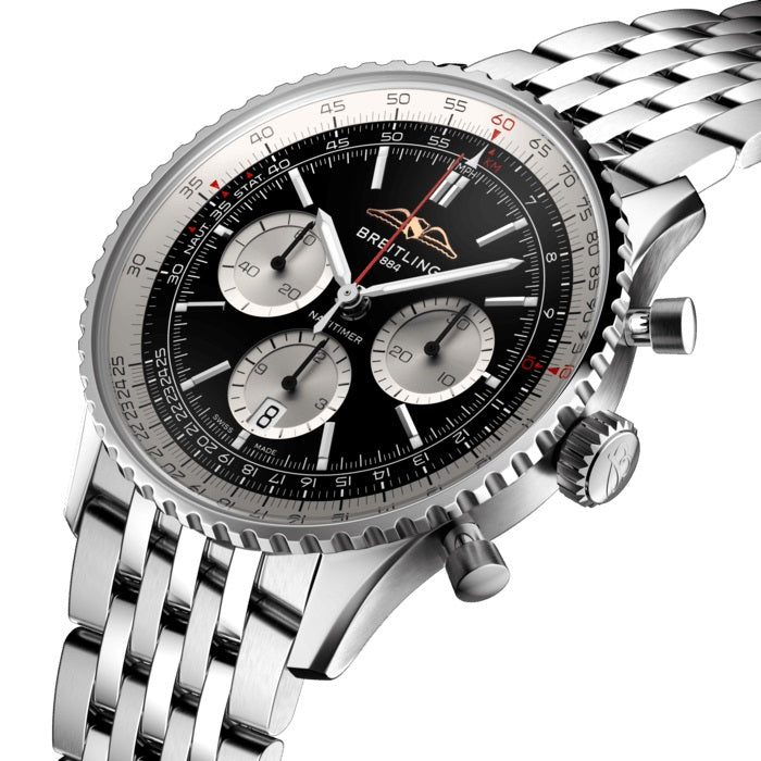 Breitling Navitimer B01 Chronograph. Black Dial 43 mm Stainless Steel case. Bidirectional, slide rule bezel. Cambered sapphire, glareproofed both sides crystal. Breitling 01 calibre, Self-winding mechanical, 70 hours power reserve, 47 jewels. Stainless Steel bracelet. Water resistance 30 m