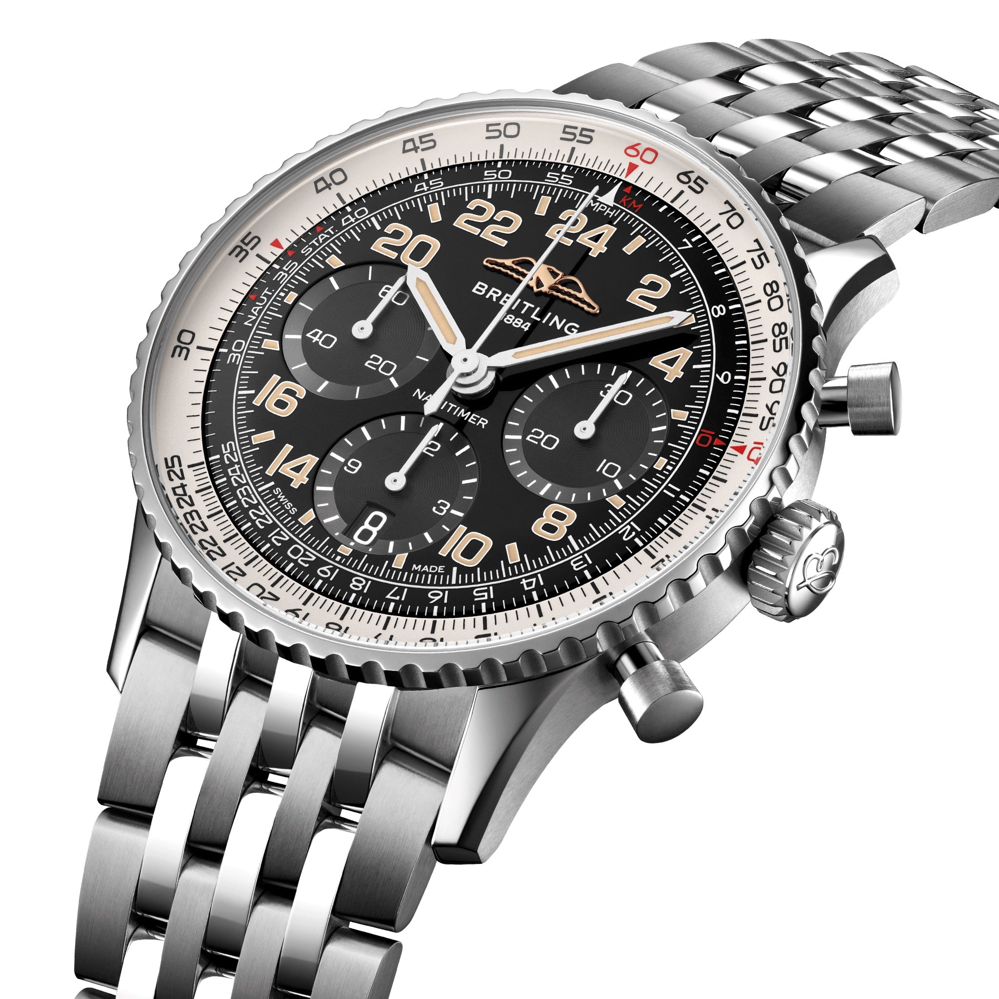 Unworn Breitling Navitimer B02 CHRONOGRAPH 41 COSMONAUTE PB02301A1B1A1, 41 mm, Black Dial, Stainless steel & platinum case. Bidirectional, slide rule bezel. Cambered sapphire, glareproofed both sides crystal. Breitling B02 (Manufacture) calibre, Mechanical hand-wound movement, 78 hours power reserve, 39 jewels. Stainless steel bracelet. Water resistance 30 m