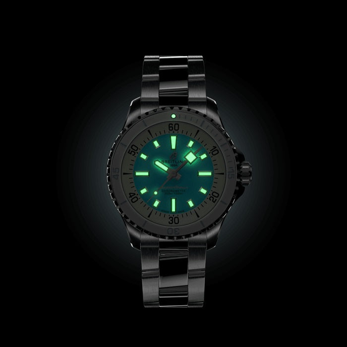 Unworn Breitling Superocean Automatic A17377211C1A1, 36 mm, Turquoise Dial, Stainless steel case. Unidirectional, ratcheted bezel. Cambered sapphire, glareproofed both sides crystal. Breitling 17 calibre, self-winding mechanical movement, 38 hours power reserve, 26 jewels. Stainless steel bracelet. Water resistance 300 m (1,000 ft)