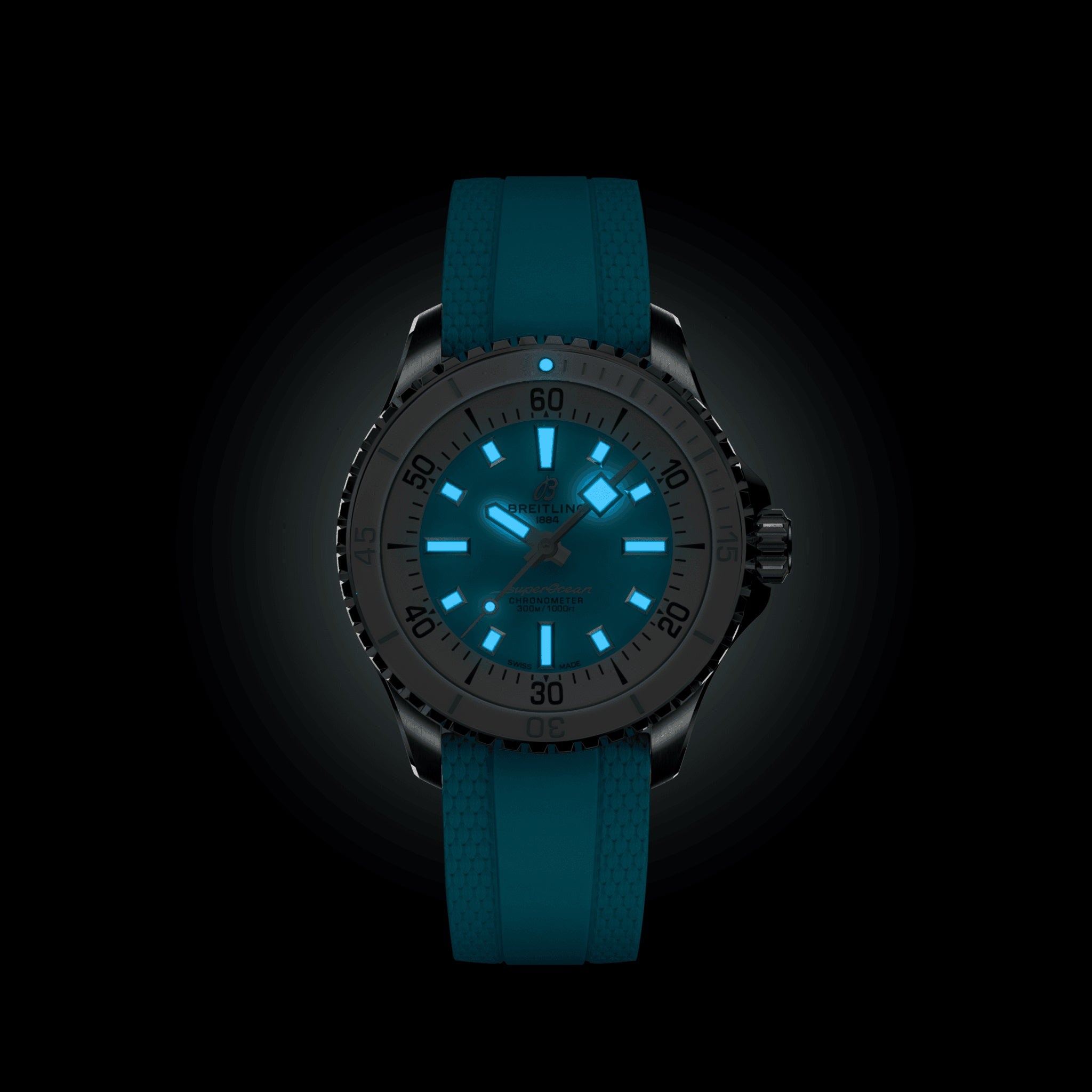 Introducing Unworn Breitling Ladies Watch Superocean Automatic 36, Stainless steel case, Reference A17377211C1S1: a fusion of style and functionality, designed to accompany you on every underwater adventure and beyond. Crafted with precision engineering and unmistakable Breitling flair, this timepiece is not just a watch—it’s a companion for the explorers of the deep and the adventurers of life. The 36mm case is made from durable brushed and polished finished Stainless steel and provides the perfect balance of appearance and comfort on the wrist. Sporty, fresh and vibrant, this model features a matte Turquoise main dial which is decorated a Silver-tone “B” logo at 12 o’clock and large silver luminous hour markers. It features an impressive Silver flange with a clearly readable minute scale, on which every 10 minutes are marked with large black Arabic numerals. The dial is decorated with polished Silver-tone hour and minute hands with luminous fill. An elegant Silver-tone central seconds hand with a luminous circle and a tip harmoniously complements them. The watch has a screw-locked screwing down crown of polished Stainless steel with two spacers. Its ribbed edge provides a comfortable grip. The Breitling logo is applied to the end of the crown. The dial closed by a convex sapphire crystal, glare-proofed both sides and solid Stainless steel case back. Unidirectional Stainless steel ratcheting bezel with ribbed edge, adorned with a polished White ceramic ring with luminous starting point and dive scale displays precise dive times. Breitling Caliber 17 contains 26 Jewels and has an approximate power reserve of 38 hours. The model is presented on Breitling’s iconic and comfortable a Turquoise Straight Rubber strap, which fastens on Stainless Steel Push Button Folding Clasp. The water resistance is up to 300m (1000ft).