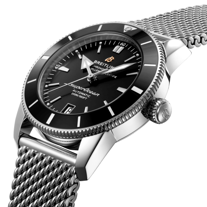 Breitling Superocean Heritage B20 Automatic 42 watch, polished stainless steel case 42mmm Reference AB2010121B1A1. The model has Black dial with a gold tone “B” Breitling emblem. This clock is bold   the iconic triangular-shaped large silver-tone different hands of polished steel with bold luminescent fill and applied polished stainless steel index hour markers with painted luminescent dot hour markers. Fine printed minute/seconds track with 15-minute Arabic numerals intervals on the outer perimeter. Date window located at the 6 o’clock position. The dial closed by a Cambered Scratch-resistant Sapphire Crystal with glare-proofed both sides. The watch has polished Stainless steel screw-locked crown with two gaskets. The crown has a ribbed edge for a comfortable grip and Breitling logo. They have solid screwed case back of Stainless steel. The watch is equipped Stainless Steel   unidirectional-ratcheted rotating fluted bezel with a black ceramic top ring with silver in the form of index markers and a triangle at the origin. The Model comes with Breitling Caliber B20, beats at 28’800 vph, contains 26 Jewels and has an approximate power reserve of 70 hours. The watch presented on the Mesh bracelet of Stainless Steel with Fold over clasp with a safety release. The water resistance is up to 200m/660ft.