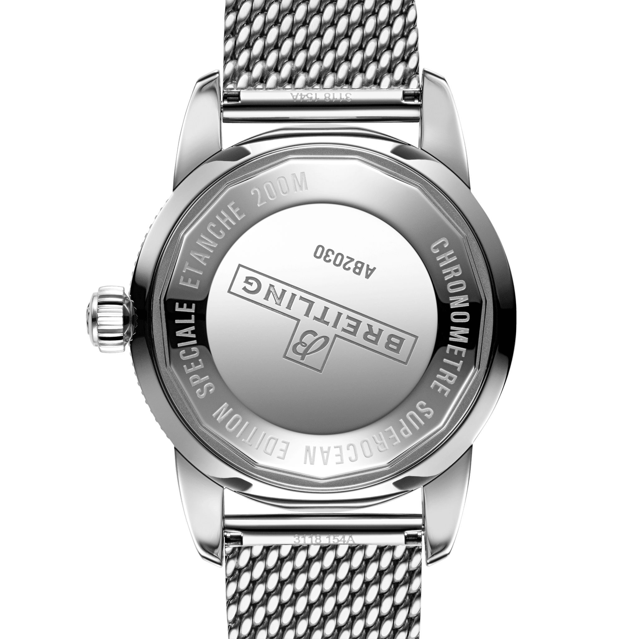 Breitling Superocean Heritage B20 Automatic 44 watch, polished stainless steel case 44mm, Reference AB2030121B1A1. The model has Black dial and is bold the iconic triangular-shaped large silver-tone different hands of polished steel with bold luminescent fill and applied polished stainless steel index hour markers with painted luminescent dot hour markers. Fine printed minute/seconds track with 15-minute Arabic numerals intervals on the outer perimeter. Date window located at the 6 o’clock position. The dial closed by a Cambered Scratch-resistant Sapphire Crystal with glare-proofed both sides. The watch has polished Stainless steel screw-locked crown with two gaskets. The crown has a ribbed edge for a comfortable grip and Breitling logo. They have solid screwed case back of Stainless steel. The watch is equipped Stainless Steel unidirectional-ratcheted rotating fluted bezel with a black ceramic top ring with silver in the form of index markers and a triangle at the origin. The Model comes with Breitling Caliber B20, beats at 28’800 vph, contains 26 Jewels and has an approximate power reserve of 70 hours. The watch presented on the Mesh bracelet of Stainless Steel with Fold over clasp with a safety release. The water resistance is up to 200m/660ft.