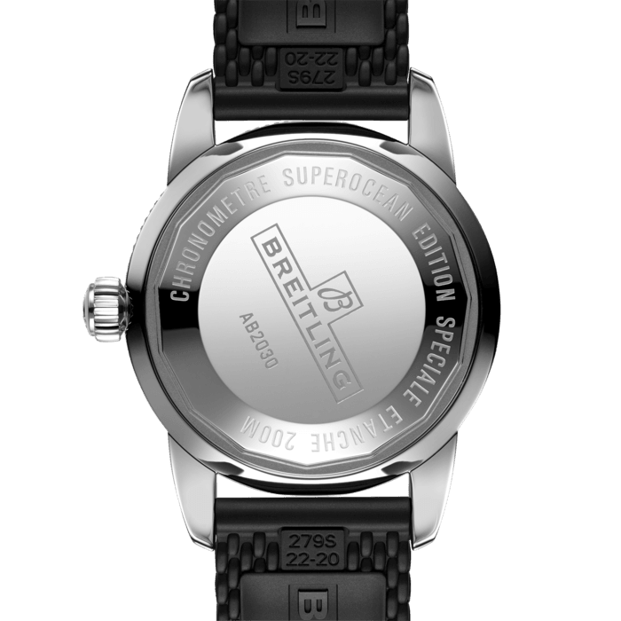 Breitling Superocean Heritage B20 Automatic 44 watch, polished stainless steel case 44mm, Reference AB2030121B1S1. The model has Black dial and is bold the iconic triangular-shaped large silver-tone different hands of polished steel with bold luminescent fill and applied polished stainless steel index hour markers with painted luminescent dot hour markers. Fine printed minute/seconds track with 15-minute Arabic numerals intervals on the outer perimeter. Date window located at the 6 o’clock position. The dial closed by a Cambered Scratch-resistant Sapphire Crystal with glare-proofed both sides. The watch has polished Stainless steel screw-locked crown with two gaskets. The crown has a ribbed edge for a comfortable grip and Breitling logo. They have solid screwed case back of Stainless steel. The watch is equipped Stainless Steel unidirectional-ratcheted rotating fluted bezel with a black ceramic top ring with silver in the form of index markers and a triangle at the origin. The Model comes with Breitling Caliber B20, beats at 28’800 vph, contains 26 Jewels and has an approximate power reserve of 70 hours. The watch presented on the Black Rubber Aero Classic strap with Push Button Folding Clasp. The water resistance is up to 200m/660ft.