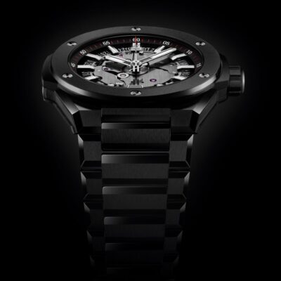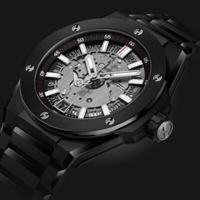 Hublot Big Bang Integrated Time Only Black Magic, 40mm, black Ceramic, Reference# 456.CX.0170.CX. An unworn man’s watch with a modern, bold design, in perfect harmony with the finest Hublot traditions, with a satin and polished black Ceramic case. The bezel lug and black composite resin case strap are recognizable features of this model. This model features a sapphire skeleton dial with silver index hour markers with luminous fill. Large silver-tone minute and hour hands with luminous filled tops and skeletonized bottoms ensure perfect legibility in all conditions. A red tip and a counterweight in the form of the manufacturer’s «H» emblem distinguish the elegant central second’s hand. Along the perimeter of the dial is a raised cone-shaped black inner bezel with a red minute track and white Arabic numerals in 5-minute increments. The Titanium crown features a screw-down design and a black composite resin guard with contoured grooves for improved grip. The dial closed by a Scratch-resistant Sapphire Crystal with Anti-reflective Treatment. The case back of the watch is also made of sapphire crystal, allowing you to observe the fantastic work of the watch movement. The watch is equipped fixed Satin-finished and Polished Black Ceramic bezel, secured 6 immediately recognizable Hublots signature “H” screws style of Titanium. Their flawless operation is ensured Hublot Caliber HUB1710 Self-winding Movement, contains 27 Jewels and has an approximate power reserve of 50 hours. This model is presented on an elegant and comfortable Satin-finished and Polished Black Ceramic integrated bracelet with an Titanium and Black-plated Deployant Buckle Clasp. The water resistance is up to 100m/330ft (10 ATM).