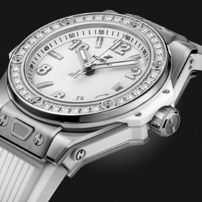 Unworn Hublot Big Bang ONE CLICK STEEL WHITE DIAMONDS 485.SE.2010.RW.1204. 33 mm, Matte White dial, Polished and Satin-finished Stainless Steel case, Sapphire with Anti-reflective Treatment crystal, Polished Stainless Steel Set with 36 Diamonds for 0.76ct bezel, HUB1120 calibre, Self-winding Movement, 40hours power reserve, White Structured Lined Rubber Straps with Stainless Steel Deployant Buckle Clasp. Water resistant to 100 m.
