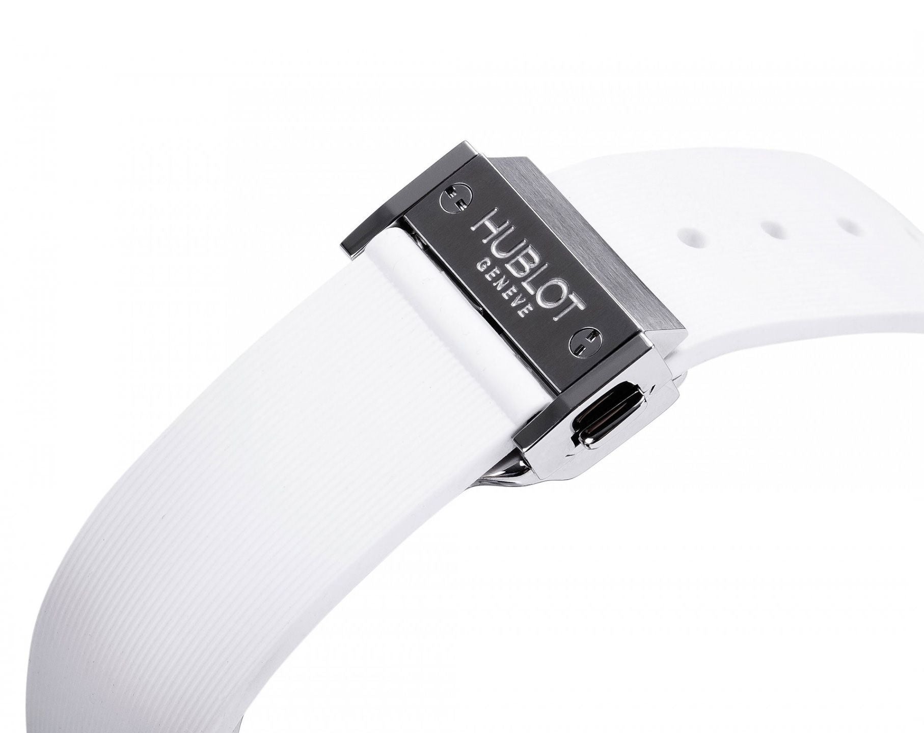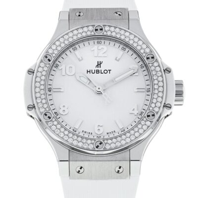 Hublot Big Bang, Steel, White Diamonds, 38mm watch, Stainless Steel case with brushed and polished finishes, Reference 361.SE.2010.RW.1104. Case center (edge) lateral white composite resin inserts. This model has Matte white dial with applied brushed finished stainless steel “applique” style alternating Arabic Numerals and Index hour markers. Brushed finished stainless steel hands with luminous filled tips (minutes and hours hands semi-skeleton). Printed minute track with 5-minute Arabic numerals intervals on the outer perimeter of the dial. Stainless steel Push/pull crown with white rubber center/insert with the Hublot logo. The dial closed by a Scratch-resistant Sapphire Crystal with Anti-reflective Treatment. The watch is equipped fixed Stainless steel bezel set with 126 diamonds weighing +/- 0.87 carats. The watch is Hublot quartz/battery powered Caliber HUB 2900, contains 7 Jewels and has an approximate power reserve of 3-5 years. This model presented on a White Structured Lined Rubber Strap with Stainless Steel Deployant Buckle Clasp. The water resistance is up to 100m/330ft (10 ATM).