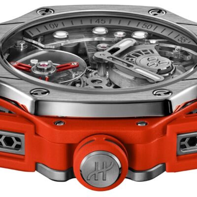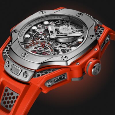 Unworn Hublot Big Bang TOURBILLON SAMUEL ROSS Ref# 428.NX.0100.RX.SRA22. 44 mm, Sapphire dial, Satin-finished and Polished Titanium case, Sapphire with Anti-reflective Treatment crystal, Satin-finished and Polished Titanium bezel, HUB6035 calibre, Automatic Tourbillonl movement, 72 h power reserve, Orange smooth rubber straps with Titanium Deployant Buckle Clasp. Water resistant to 30 m.