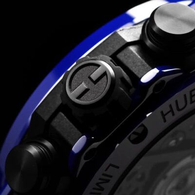 Hublot Big Bang Unico Blue Magic, 42mm watch, blue ceramic case, satin/brushed finished with fine polished corners, Reference 441.ES.5119.RX. This model has Blue and Matte Black Skeleton dial with applied applique style Arabic numerals and index hour markers with luminous fill. Blue dial flange with a minute/seconds track. Bold blue brushed finished hands with luminous fill (minutes and hours hands semi-skeleton). Small running seconds sub-dial hand located at the 9 o’clock position. Date window located between the 3 o’clock positions. Screw-down crown. The dial closed by a Scratch-resistant Sapphire Crystal with Anti-reflective Treatment. Of Sapphire Crystal made transparent case back. Chronograph stopwatch functions: column wheel chronograph mechanism; features a Flyback function, which allows instant restarting of the chronograph with a single push of the button; large central seconds counter with the “H” logo as a counter-weight; 60-minute counter sub-dial at 3 o’clock. The watch is equipped fixed blue ceramic bezel, secured 6 immediately recognizable Hublots signature “H” screws style of Titanium. The watch is Hublot Caliber HUB 1280 UNICO Manufacture Self-winding Chronograph Flyback Movement with Column Wheel automatic movement, contains 43 Jewels and has an approximate power reserve of 72 hours. This model presented on a Black and Blue Structured Lined Rubber Strap with Black Ceramic and Black-plated Titanium Deployant Buckle Clasp. The water resistance is up to 100m/330ft (10 ATM).
