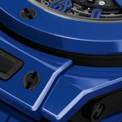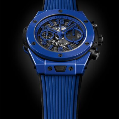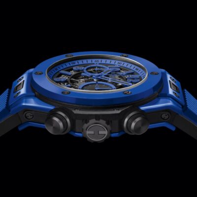 Hublot Big Bang Unico Blue Magic, 45mm watch, Reference 411.ES.5119.RX. Limited Edition of 500 Pieces. Microblasted blue ceramic case with polished finished beveled corners. Case center (edge) lateral black composite resin inserts. This model has Sapphire crystal transparent Dial with Blue “Applique” style alternating Arabic Numeral and index hour markers with luminous fill. Raised/tapered blue inner bezel flange on the perimeter of the dial with black printed minute/seconds track and printed 5 seconds increments in Arabic numerals. Blue minute and hour hands with luminous filled tops and skeletonized bottoms. Date window with white background located at the 3 o’clock position. Small running seconds sub-dial hand located at the 9 o’clock position. Chronograph/Stopwatch functions: column wheel chronograph; features a “Flyback” function, which allows instant restarting of the chronograph with a single push of the button instead of the need to stop, reset and then restart the stop-watch; large central seconds counter; 60-minute counter sub-dial located at the 3 o’clock position. The chronograph is adjusted using Titanium round shaped buttons. Titanium crown with function Pull/push with black rubber around for enhanced grip. The dial closed by a Scratch-resistant Sapphire Crystal with Anti-reflective Treatment. Of Sapphire Crystal made transparent case back. The watch is equipped fixed Blue ceramic bezel, secured 6 immediately recognizable Hublots signature “H” screws style of Titanium. The watch is Hublot Caliber HUB 1242 UNICO Manufacture Self-winding Chronograph Flyback Movement with Column Wheel, contains 38 Jewels and has an approximate power reserve of 72 hours. This model presented on a black and blue Structured Lined Rubber Straps with Titanium Deployant Buckle Clasp. Straps are easily interchangeable via a unique quick-release push-button system developed by Hublot. The buttons are located on the top and bottom central lugs (this watch is delivered with a single strap only). The water resistance is up to 100m/330ft (10 ATM).