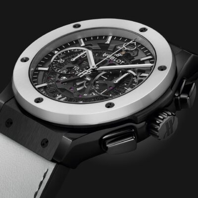 Unworn Hublot Classic Fusion AEROFUSION ASPEN SNOWMASS 525.CH.0121.VR.ASP21. 45 mm, Sapphire dial with special logo ASP21 Polished rhodium-plated appliques dial, Satin-finished and polished black Ceramic case, Sapphire with Anti-reflective Treatment crystal, Satin-finished and Polished White Ceramic with 6 H-shaped Titanium Screws bezel, HUB1155 calibre, Self-winding Skeleton Chronograph Movement, 42 Hours power reserve, Black rubber and white calf with black stitching with Black PVD Stainless Steel Deployant Buckle Clasp. Water resistant to 50 m.