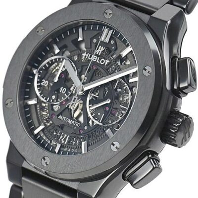 Hublot Classic Fusion Aerofusion Black Magic Bracelet 45mm watch. Polished black ceramic case with brushed finished top and bottom center links between the lugs, Reference 528.CM.0170.CM. This model has Transparent sapphire crystal main dial with applied polished finish Stainless Steel index hour markers. Black inner bezel flange on the perimeter of the dial with fine printed minute/seconds track. Polished finished stainless steel hands. Small-seconds sub-dial located at the 3 o’clock position. Chronograph/Stopwatch function: large central seconds counter with the “H” logo as a counter-weight; 30-minute sub-dial counter located at the 9 o’clock position. Polished black ceramic chronograph buttons. Date disc with black plated skeletonized date numbers, white background located at the 6 o’clock position to indicate the current date. Polished black ceramic crown with the Hublot logo. The dial closed by a Scratch-resistant Sapphire Crystal with Anti-reflective Treatment. Of Sapphire Crystal made transparent case back. The watch is equipped fixed polished black ceramic bezel with brushed finished top and polished finished beveled edges, secured with 6 polished “H” style Titanium screws. Black composite resin “bezel lug” sandwiched between the bezel and case. The watch is self-winding mechanical Hublot Caliber HUB1155, contains 60 Jewels and has an approximate power reserve of 42 hours. This model presented on a Polished and Satin-finished Black Ceramic Bracelet with Black-plated Titanium Deployant Buckle Clasp. The water resistance is up to 50m/150ft (5 ATM).