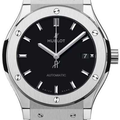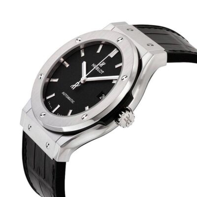 Hublot Classic Fusion Automatic 38mm Midsize watch, polished titanium case with brushed finished top and bottom center links between the lugs. This model has flat matte black dial with silver-tone polished rhodium plated hands and applied index hour markers. Date window located the 3 o’clock positions. Polished titanium crown engraved with the Hublot logo. The dial closed by a Scratch-resistant Sapphire Crystal with Anti-reflective Treatment. Of Sapphire Crystal, transparent case back made. The watch is equipped fixed Grey Titanium bezel with a brushed finished top and polished finished beveled edge, secured with 6 polished “H” style titanium screws. Black composite resin “bezel lug” sandwiched between the bezel and case. The watch is self-winding mechanical Hublot Caliber HUB1110 contains 21 Jewels and has an approximate power reserve of 42 hours. This model presented on a Black Rubber and Alligator Leather Straps with Stainless Steel Deployant Buckle Clasp. The water resistance is up to 50m/150ft (5 ATM).