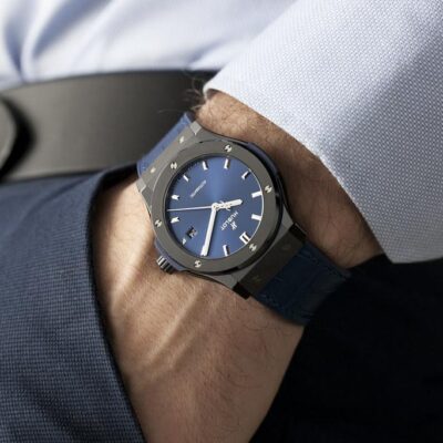 Hublot Classic Fusion Automatic 45mm Ceramic Blue watch, polished and satin-finished black ceramic case with brushed finished top and bottom center links between the lugs, Reference 510.CM.7170.CM. This model has satin-finished Blue Sunray dial with applied brushed finished stainless steel “applique” style index hour markers and polished rhodium plated hands. Date window located the 3 o’clock positions. Polished black ceramic crown with rubber tip insert. On it, the Hublot logo engraved on it. The dial closed by a Scratch-resistant Sapphire Crystal with Anti-reflective Treatment. Of Sapphire Crystal made transparent case back. The watch is equipped fixed black ceramic bezel with a brushed finished top and polished finished beveled edge, secured with 6 polished “H” style titanium screws. Black composite resin “bezel lug” sandwiched between the bezel and case. The watch is self-winding mechanical Hublot Caliber HUB1112, contains 21 Jewels and has an approximate power reserve of 42 hours. This model presented on a Black ceramic bracelet with polished outer links and brushed finished center links with Black-plated Stainless Steel Deployant Buckle Clasp. The water resistance is up to 50m/150ft (5 ATM).