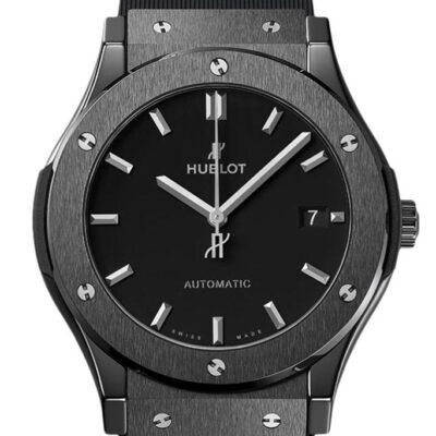Hublot Classic Fusion Automatic 45mm watch, polished black ceramic case with brushed finished top and bottom center links between the lugs, Reference 511.CM.1171.RX. This model has Matte black lacquered dial with silver-tone polished rhodium plated hands and brushed finished stainless steel “applique” style index hour markers. Date window located the 3 o’clock positions. Polished black ceramic crown with rubber tip insert. It has the Hublot logo engraved on it. The dial closed by a Scratch-resistant Sapphire Crystal with Anti-reflective Treatment. Of Sapphire Crystal made transparent case back. The watch is equipped fixed Black ceramic bezel with brushed finished top and polished finished beveled edges, secured with 6 polished “H” style titanium screws. Black composite resin “bezel lug” sandwiched between the bezel and case. The watch is self-winding mechanical Hublot Caliber HUB1112, contains 25 Jewels and has an approximate power reserve of 42 hours. This model presented on a black Lined rubber strap with Black-plated Stainless Steel Push Button Folding Clasp. The water resistance is up to 50m/150ft (5 ATM).