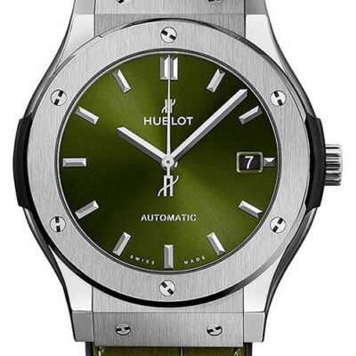 Hublot Classic Fusion Automatic 45mm watch, Grey Satin-finished and polished titanium case with brushed finished top and bottom center links between the lugs, Reference 511.NX.8970.LR. This model has Green Sunray Satin-finished dial with silver-tone polished finished stainless steel hands and applied polished finished stainless steel index hour markers. Date window located the 3 o’clock positions. Polished titanium crown with Pull / Press function. It has the Hublot logo engraved on it. The dial closed by a Scratch-resistant Sapphire Crystal with Anti-reflective Treatment. Of Sapphire Crystal transparent case back made. The watch is equipped fixed satin-finished and polished Grey Titanium bezel with a brushed finished top and polished finished beveled edge, secured with 6 polished “H” style titanium screws. Black composite resin “bezel lug” sandwiched between the bezel and case. The watch is self-winding mechanical Hublot Caliber HUB1112, contains 25 Jewels and has an approximate power reserve of 42 hours. This model presented on a black rubber strap with a stiched green (allligator) leather top with Stainless Steel Deployant Buckle Clasp. The water resistance is up to 50m/150ft (5 ATM).