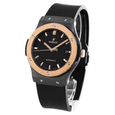 Hublot Classic Fusion Ceramic King Gold 45mm watch. Polished black ceramic case with brushed finished top and bottom center links between the lugs, Reference 511.CO.1181.RX. This model has flat matte black lacquered dial with applied brushed finished king gold toned “applique” style index hour markers and polished king gold plated hands. Date window located the 3 o’clock positions. Solid polished 18kt rose gold crown Pull / Press function and engraved with the Hublot logo. The dial closed by a Scratch-resistant Sapphire Crystal with Anti-reflective Treatment. Of Sapphire Crystal, transparent case back made. The watch is equipped fixed Solid 18kt rose gold bezel, with a brushed finished top & polished finished beveled edge, secured with 6 polished “H” style titanium screws. Black composite resin “bezel lug” sandwiched between the bezel and case. The watch is self-winding mechanical Hublot Caliber HUB1112, contains 21 Jewels and has an approximate power reserve of 42 hours. This model presented on a Black Lined Rubber Strap with 18K King Gold and Black PVD Stainless Steel Deployant Buckle Clasp. The water resistance is up to 50m/150ft (5 ATM).