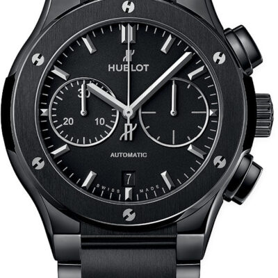 Hublot Classic Fusion Chronograph Automatic 45mm Black Magic watch, polished and satin-finished black ceramic case with brushed finished top and bottom center links between the lugs, Reference 520.CM.1170.CM. This model has Matte black dial with applied brushed finished rhodium plated index hour markers and polished rhodium plated hands. The watch has Small-seconds sub-dial located at the 3 o’clock position. Chronograph/Stopwatch function: large central seconds counter with the “H” logo as a counter-weight; 30-minute sub-dial counter located at the 9 o’clock position. Date window located the 6 o’clock positions. Polished black ceramic crown with the Hublot logo. The dial closed by a Scratch-resistant Sapphire Crystal with Anti-reflective Treatment. Of Sapphire Crystal made transparent case back. The watch is equipped fixed black ceramic bezel with a brushed finished top and polished finished beveled edge, secured with 6 polished “H” style titanium screws. Black composite resin “bezel lug” sandwiched between the bezel and case. The watch is self-winding mechanical Hublot Caliber HUB1143, contains 59 Jewels and has an approximate power reserve of 42 hours. This model presented on a Black ceramic bracelet with polished outer links and brushed finished center links with Black-plated Stainless Steel Deployant Buckle Clasp. The water resistance is up to 50m/150ft (5 ATM).