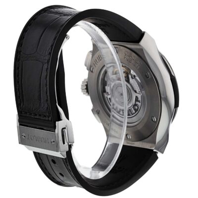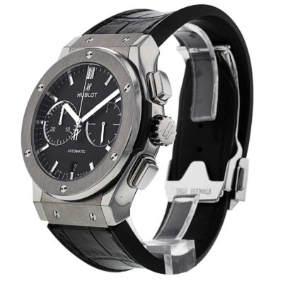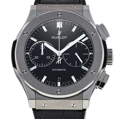 Hublot Classic Fusion Chronograph Automatic 45mm watch, Grey Satin-finished and polished titanium case with brushed finished top and bottom center links between the lugs, Reference 521.NX.1171.LR. This model has flat matte black dial with silver-tone polished rhodium plated hands and brushed finished stainless steel “applique” style index hour markers. Minute markers around the outer rim. Small-seconds sub-dial located at the 3 o’clock position. Chronograph/Stopwatch function: large central seconds counter with the “H” logo as a counter-weight; 30-minute sub-dial counter located at the 9 o’clock position. Polished titanium chronograph buttons. Date window located the 6 o’clock positions. Polished titanium crown with the Hublot logo. The dial closed by a Scratch-resistant Sapphire Crystal with Anti-reflective Treatment. Of Sapphire Crystal made transparent case back. The watch is equipped fixed Titanium bezel with brushed finished top and polished finished beveled edges, secured with 6 polished “H” style titanium screws. Black composite resin “bezel lug” sandwiched between the bezel and case. The watch is self-winding mechanical Hublot Caliber HUB1143, contains 59 Jewels and has an approximate power reserve of 42 hours. This model presented on a black rubber strap with a stiched (alligator) leather top with Stainless Steel Deployant Buckle Clasp. The water resistance is up to 50m/150ft (5 ATM).