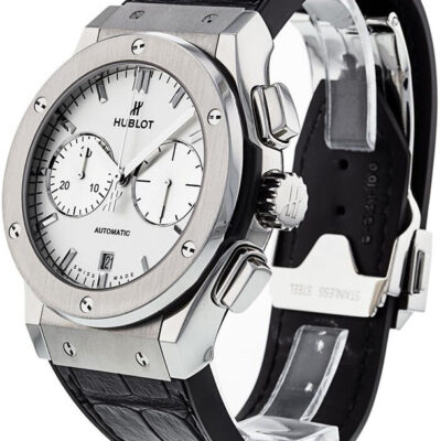 Hublot Classic Fusion Chronograph Automatic 45mm watch, Satin-finished and polished titanium case with brushed finished top and bottom center links between the lugs, Reference 521.NX.2611.LR. This model has Matte silver “opaline” main dial with contrasting metallic silvered sub-dials with silver-tone polished rhodium plated hands and brushed finished stainless steel “applique” style index hour markers. Minute markers around the outer rim. Small-seconds sub-dial located at the 3 o’clock position. Chronograph/Stopwatch function:  large central seconds counter with the “H” logo as a counter-weight; 30-minute sub-dial counter located at the 9 o’clock position. Polished titanium chronograph buttons. Date window located the 6 o’clock positions. Polished titanium crown with the Hublot logo. The dial closed by a Scratch-resistant Sapphire Crystal with Anti-reflective Treatment. Of Sapphire Crystal made transparent case back. The watch is equipped fixed Titanium bezel with brushed finished top and polished finished beveled edges, secured with 6 polished “H” style titanium screws. Black composite resin “bezel lug” sandwiched between the bezel and case. The watch is self-winding mechanical Hublot Caliber HUB1143, contains 59 Jewels and has an approximate power reserve of 42 hours. This model presented on a black rubber strap with a stiched (alligator) leather top with Stainless Steel Deployant Buckle Clasp. The water resistance is up to 50m/150ft (5 ATM).